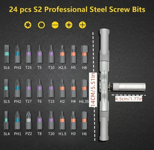 【Magnetic Precision】: Contains 24 magneticscrewdriver bits, ensuring a firm grip on screws for aseamless maintenance experience.